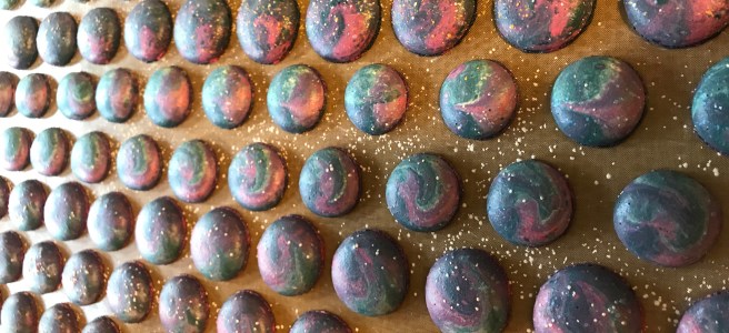 The filling…uhmmm…what could that be. Imagine your tongue is slipping through the galaxy and tasting every star, every planet and or sun along the way … what would that taste be like? Sour, sweet and spicy? Maybe raspberry, maybe mint, maybe rose water…?And yes, we came to agreement and the remaining piece of work could start… the filling … so close to the end product, so close to stuff my mouse with the unique taste…